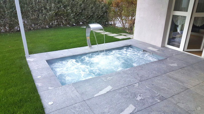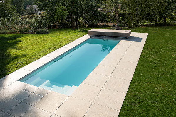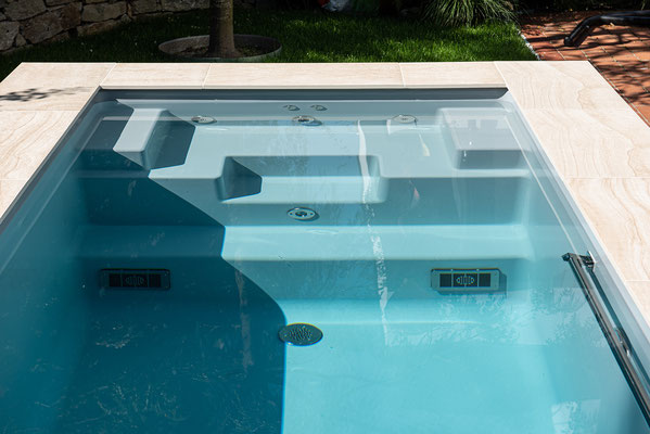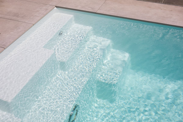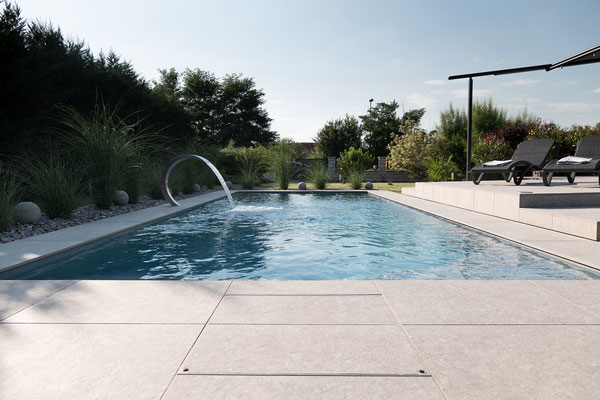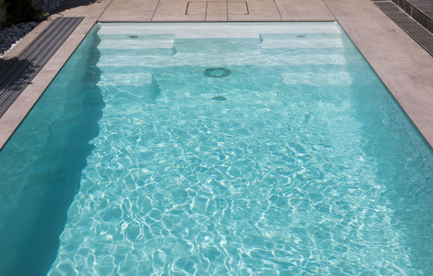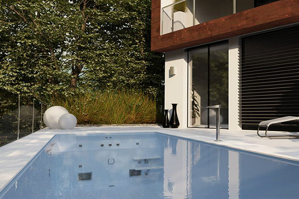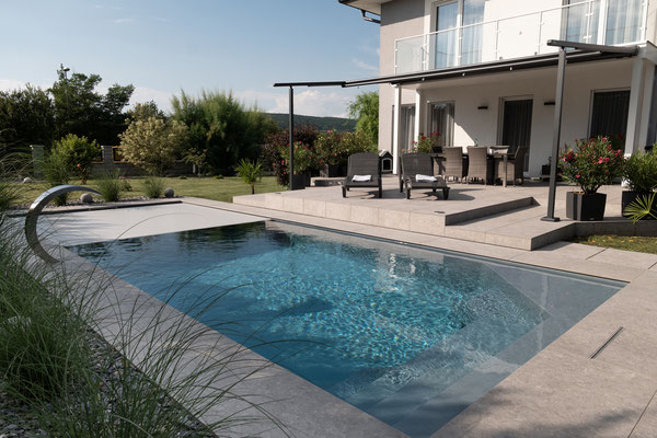 Großzügige Flachwasserzone mit Steinauskleidung und verdecktem Unterflurrollladen, elegante platzsparende Steintreppe, die links oder rechts montiert werden kann – ganz nach Ihrem Wunsch –, oder für ganz Sportliche ohne Treppe, mit Einstiegsleiter aus Edelstahl. LED-Ambientebeleuchtung an der Kante der Flachwasserzone und LED-Scheinwerfer gehören zur Standardausstattung, genauso wie die Wasserkante von 3 cm, für Genuss auf höchstem Niveau.