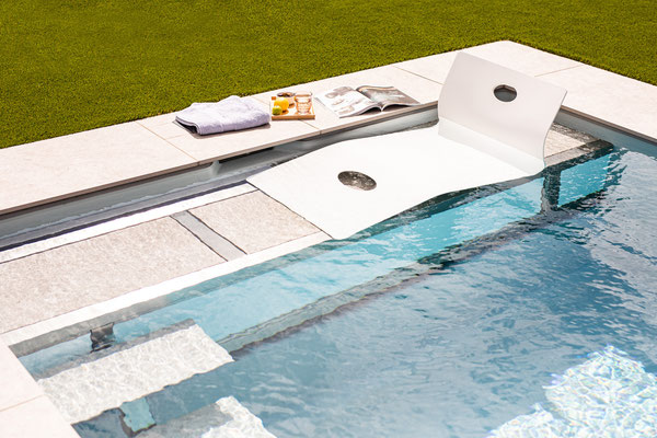 Der edle Seiteneinstieg ist ein wahrer Blickfang und verleiht LOFT 1.8 S seinen unverwechselbaren Charakter. Außerdem steht so die volle Schwimmlänge zur Verfügung. Aufsehenerregend ist auch die extrem hohe Wasserkante von lediglich 3 cm, dadurch erhält der Pool sein einmaliges Flair.