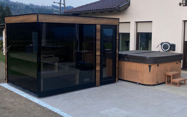 Genießen Sie die Freiheit und Frische unserer Premium – Außensauna CORTINA mit unserer exklusiven Ausstattung.